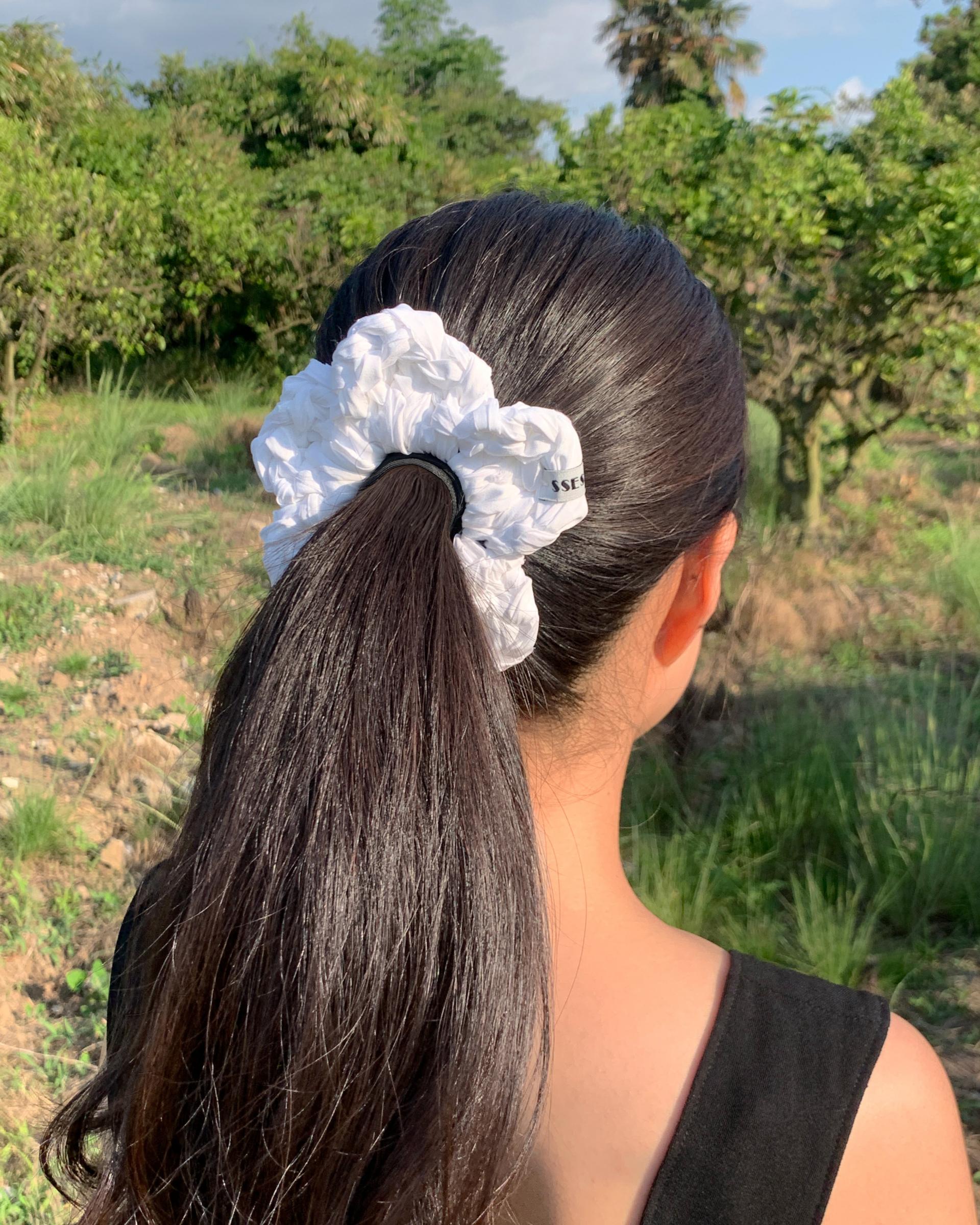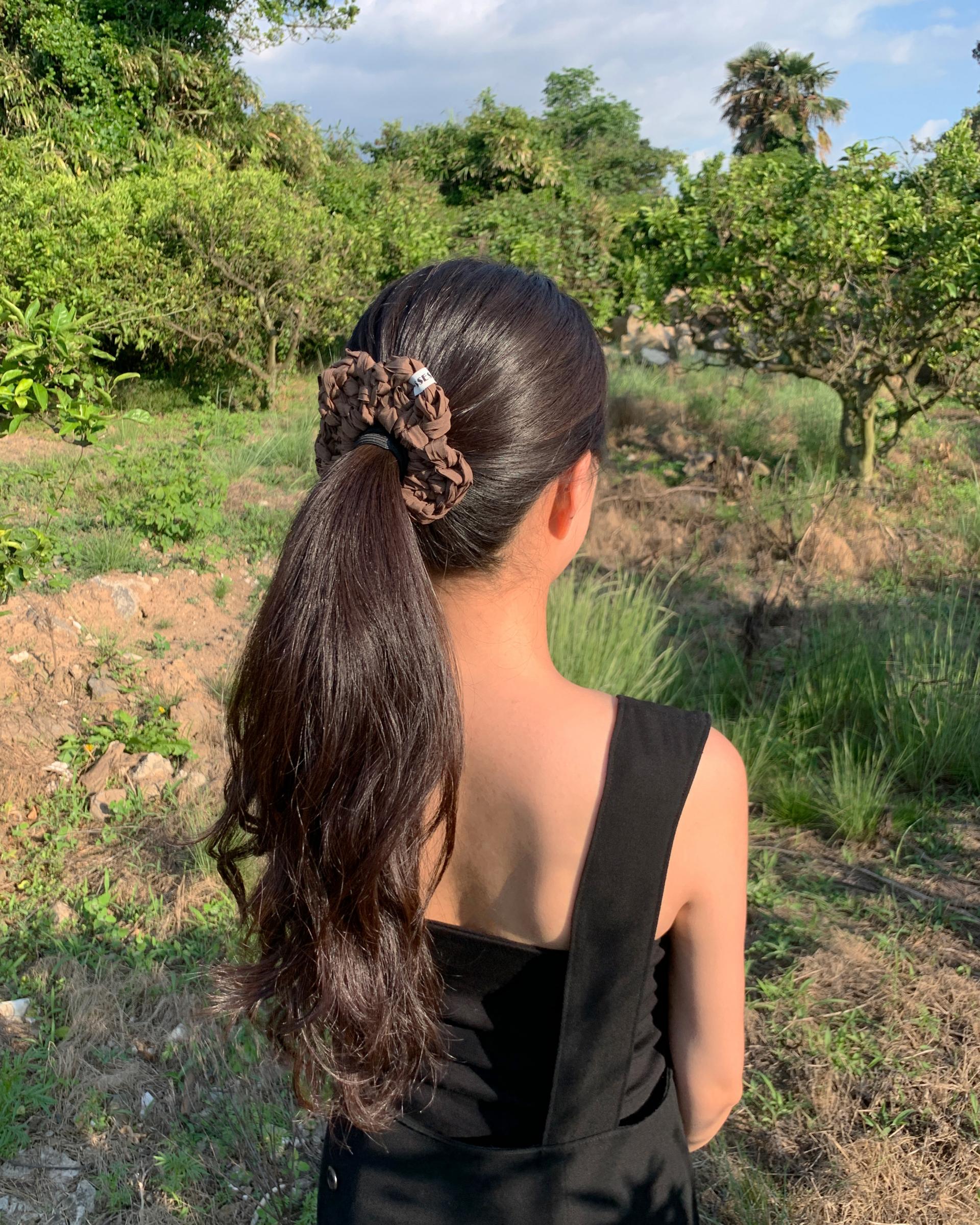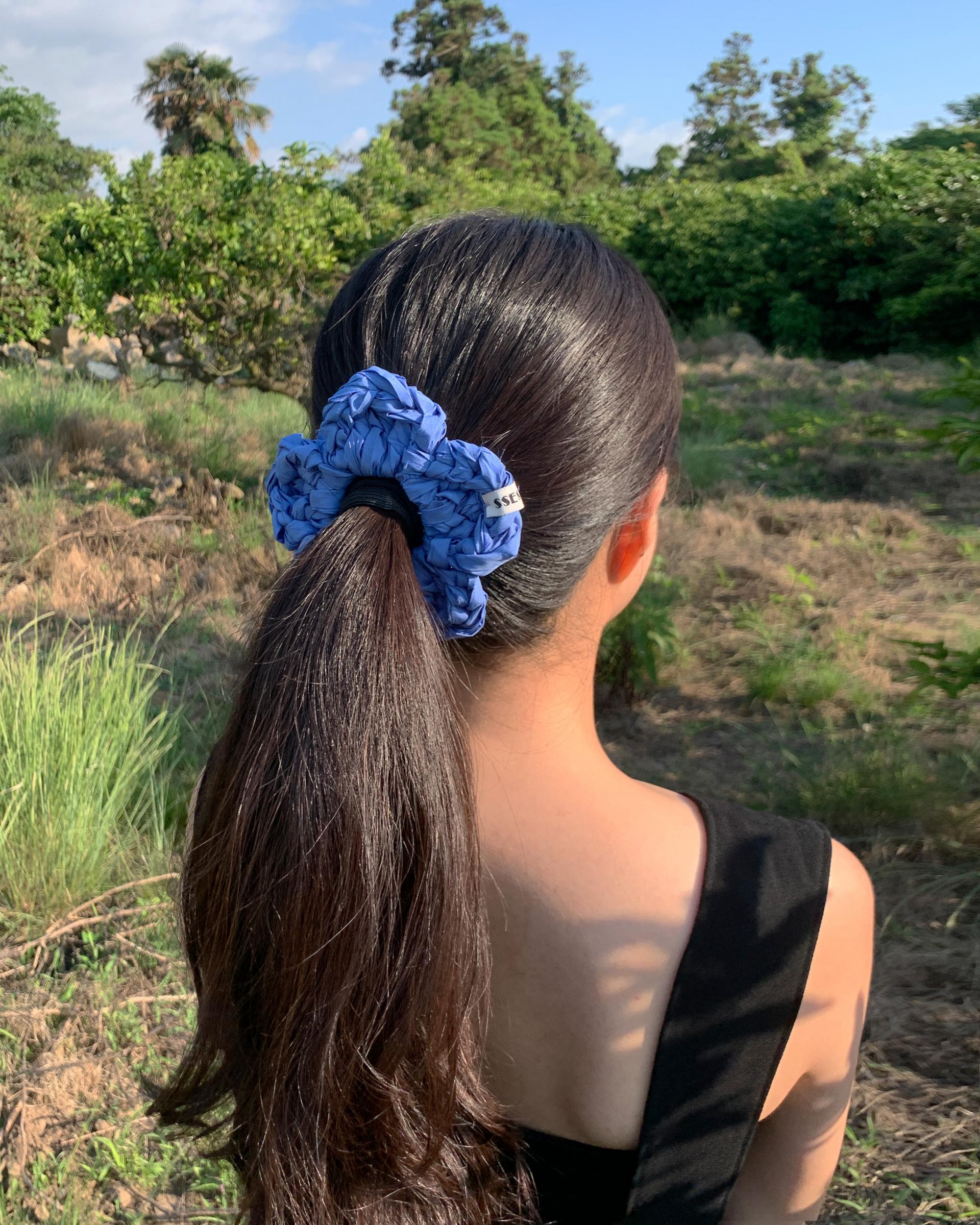 기분 좋은 촉감의 원단을 자른 실로 제작된 스크런치입니다.