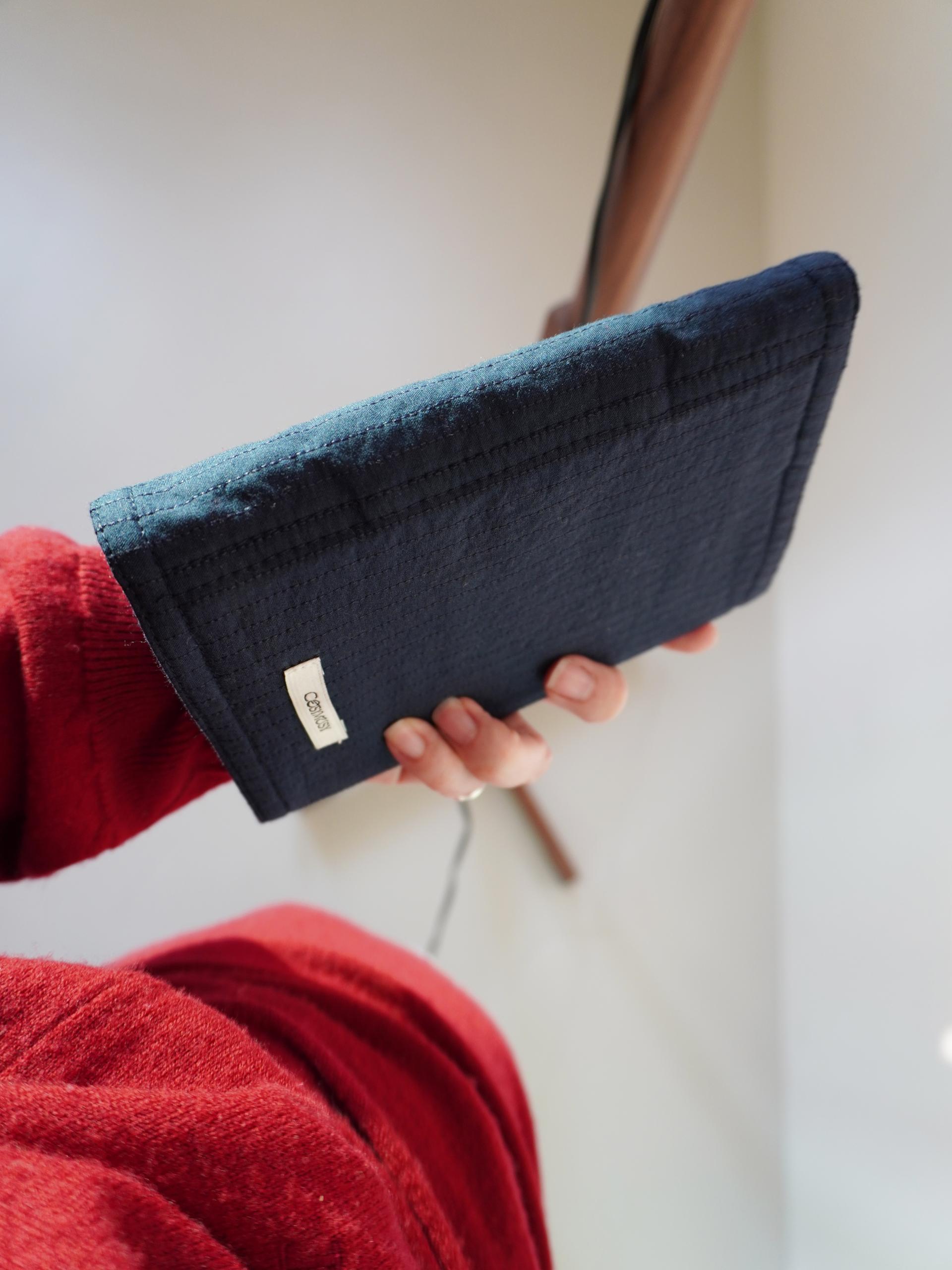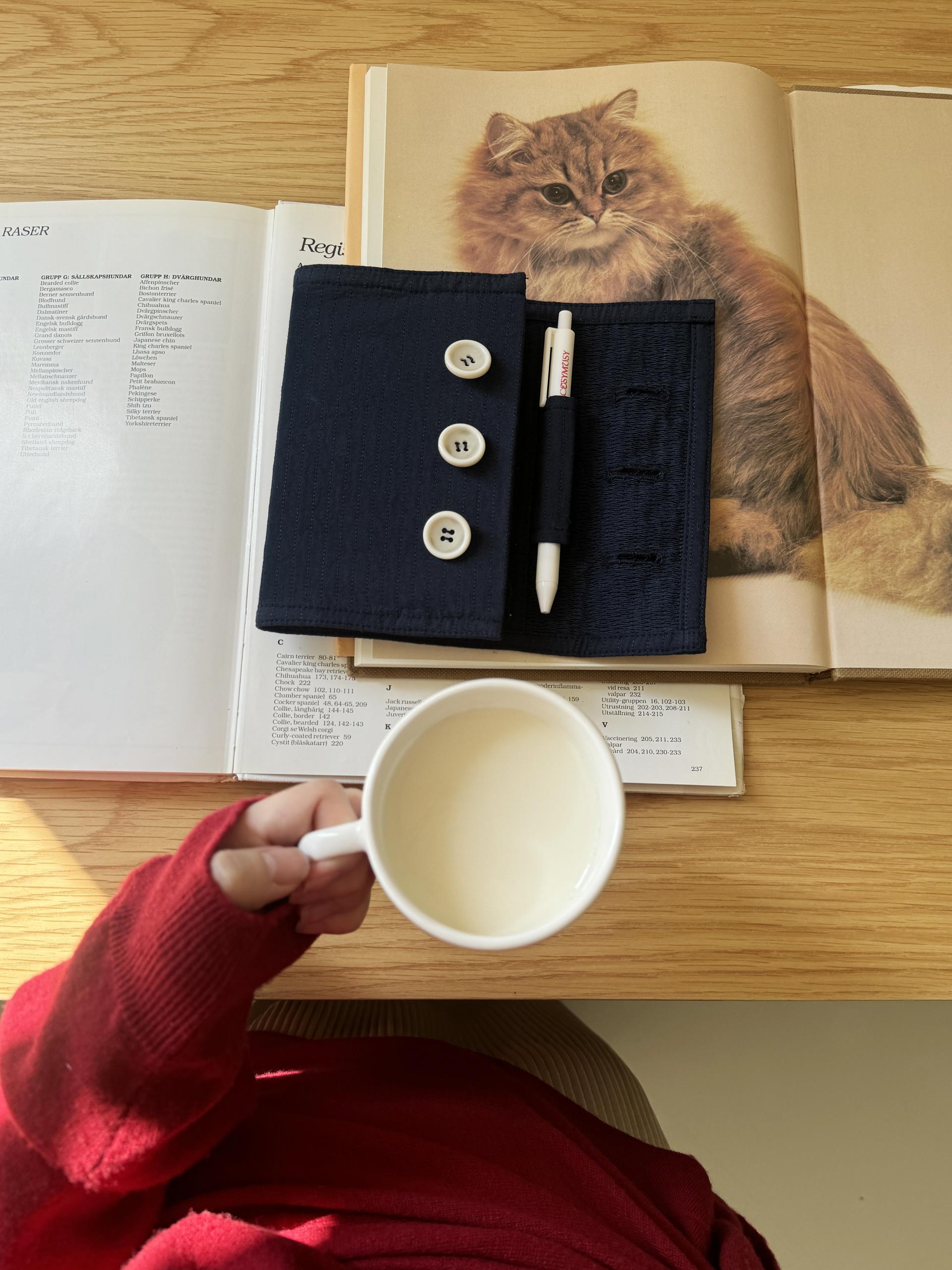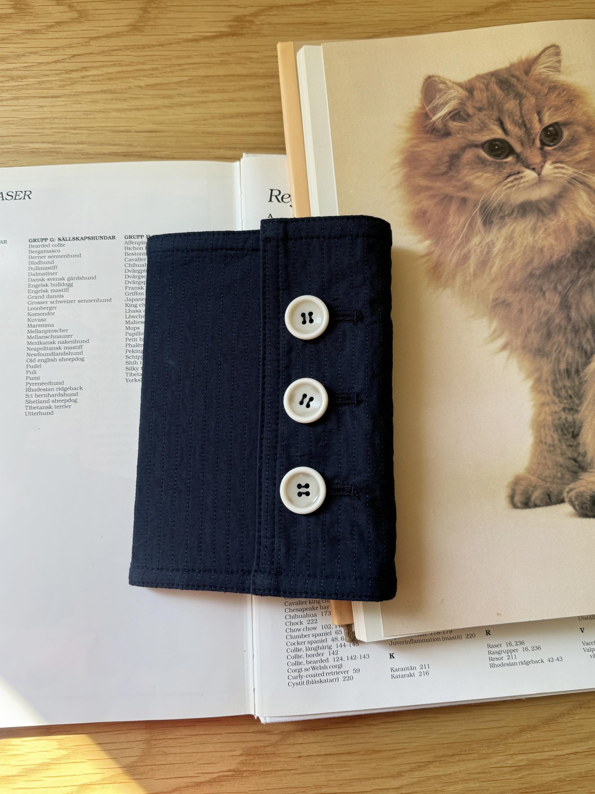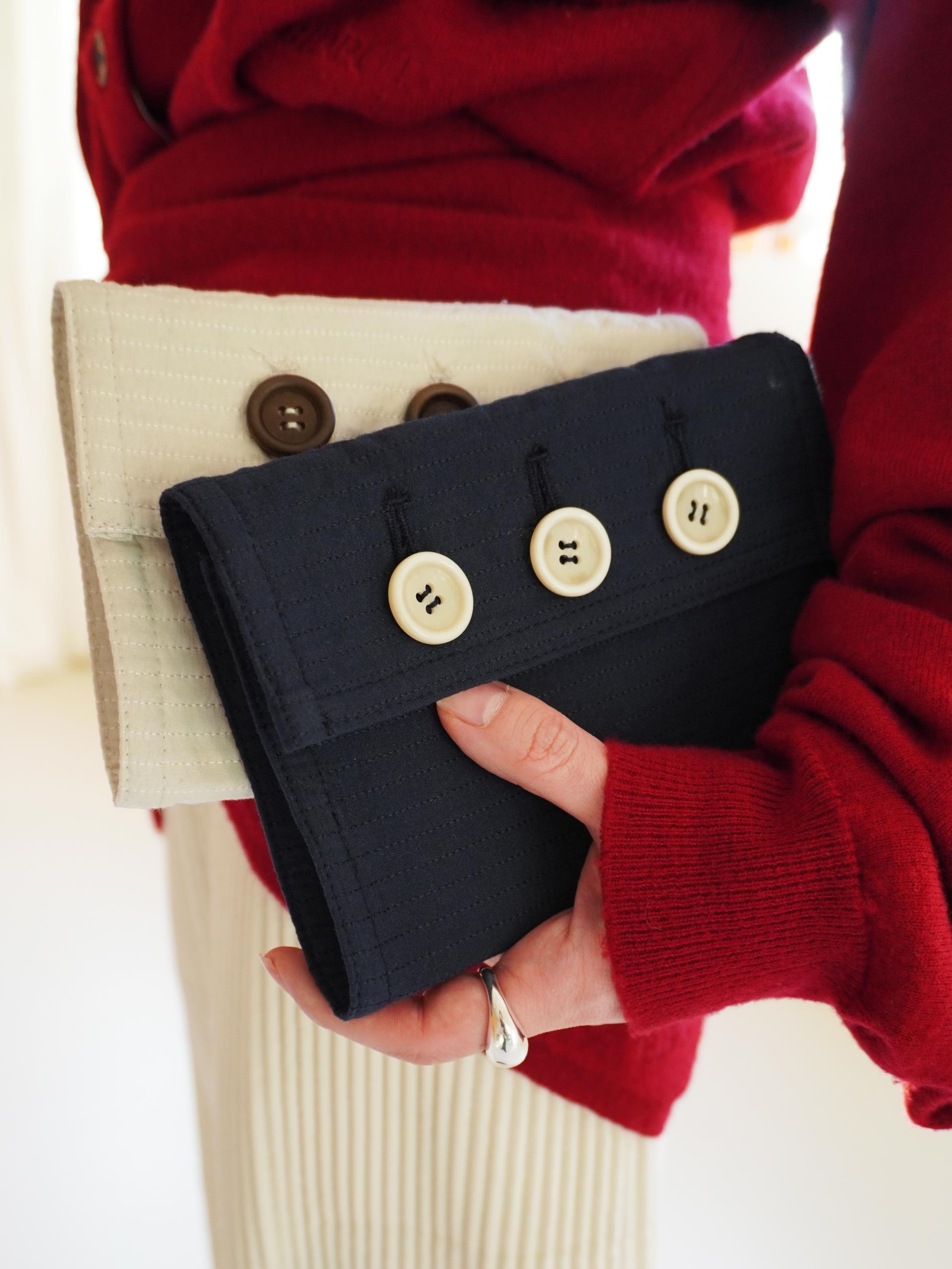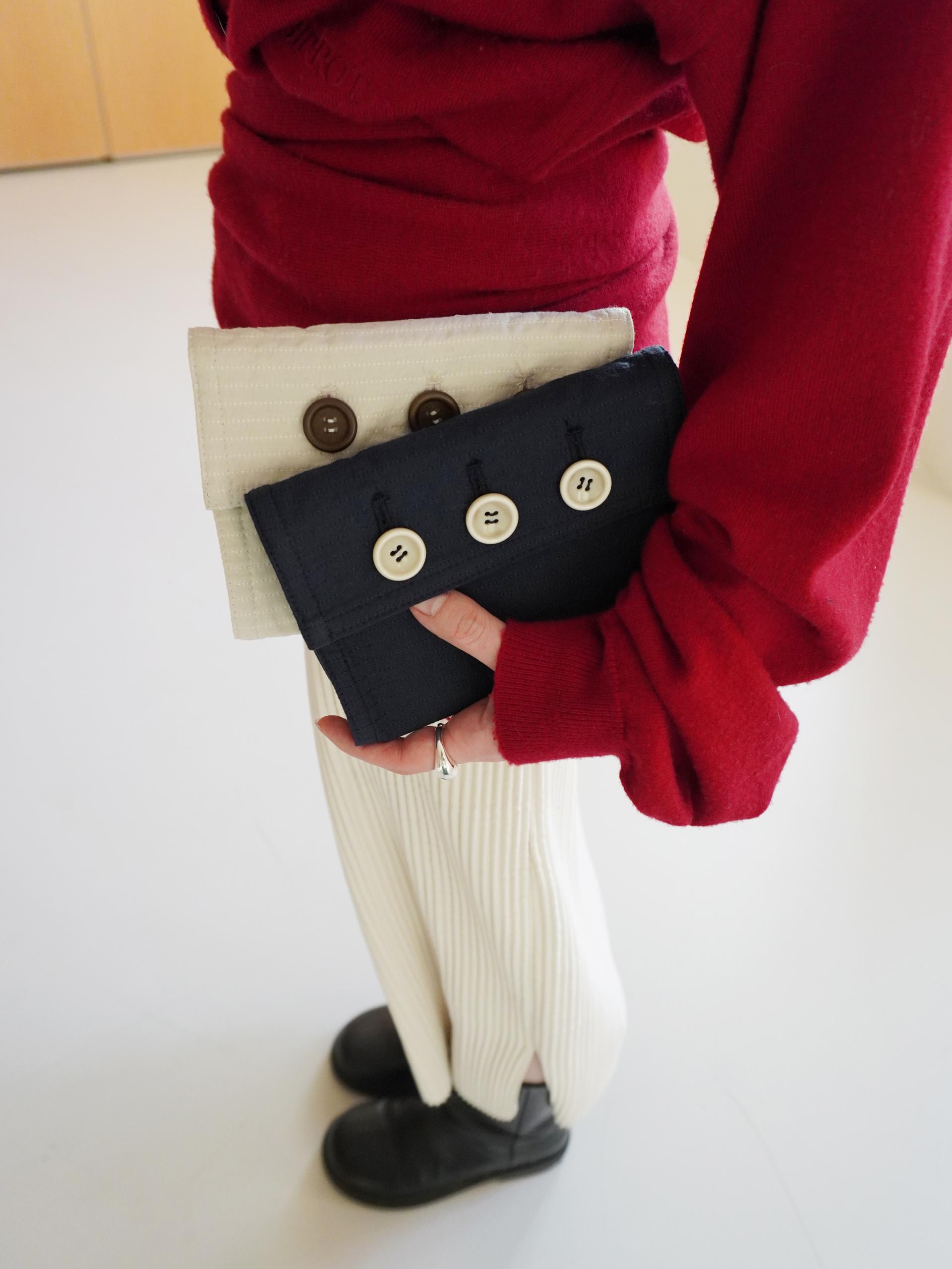 원단 컬러와 톤온톤으로 어우러지는 스티치 라인으로 디테일을 넣고 단추 3개를 더해 패브릭 노트에 포인트를 주었습니다.