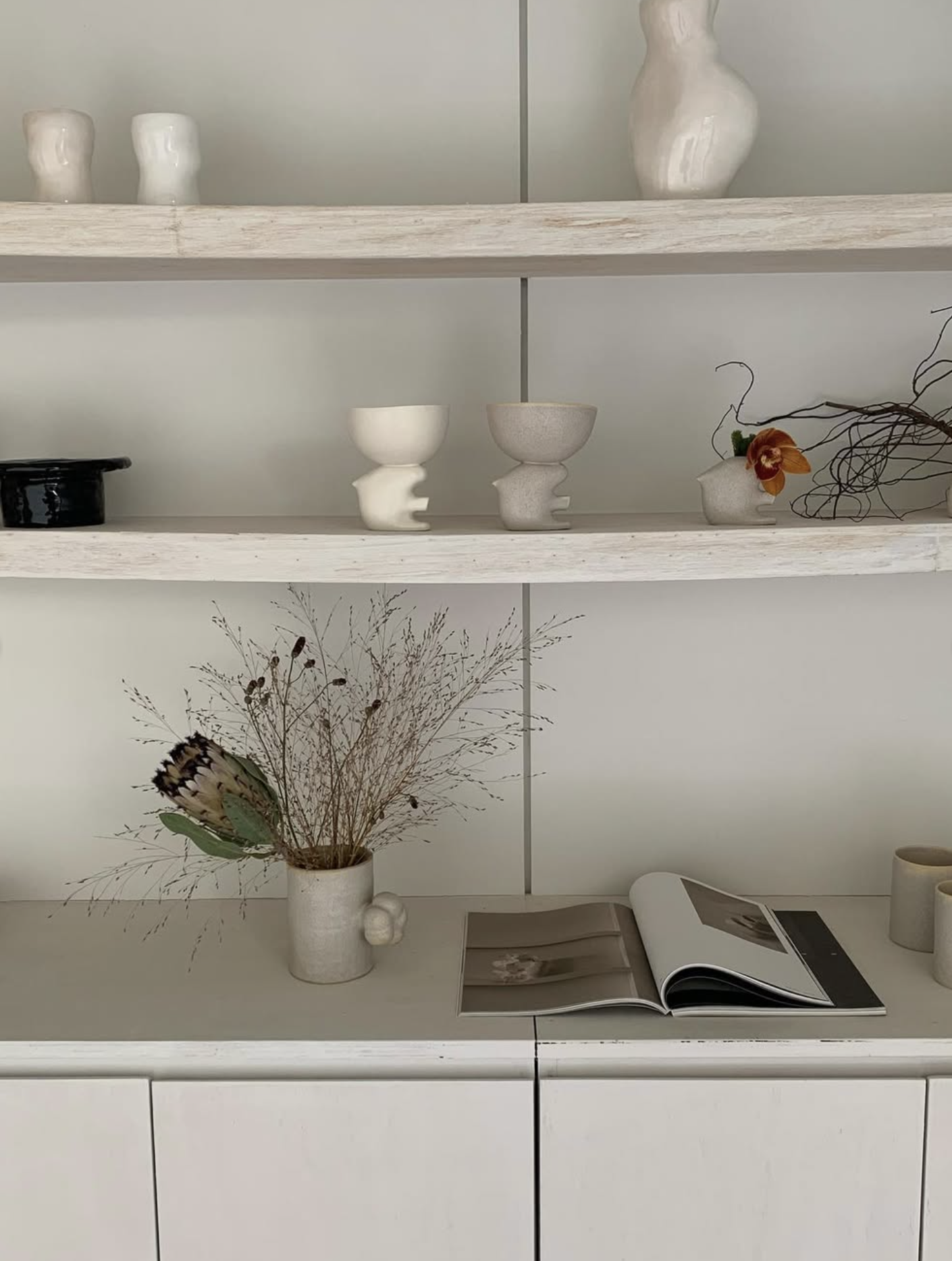 꽃과 풀을 풍성하게 꽂아 화병 대신 선반 한켠에 두는 것도 추천드릴게요.