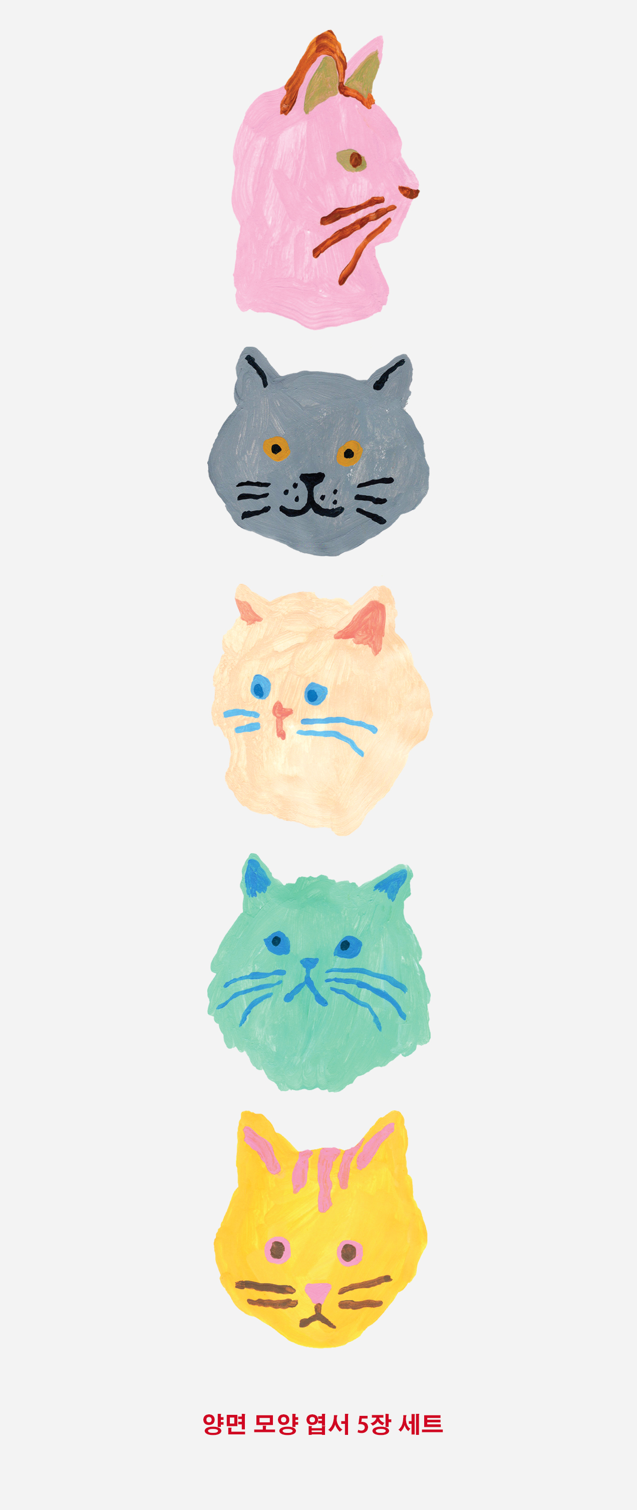 다섯 마리 고양이 드로잉으로 만든 양면 모양 엽서 5종이 들어가 있습니다.